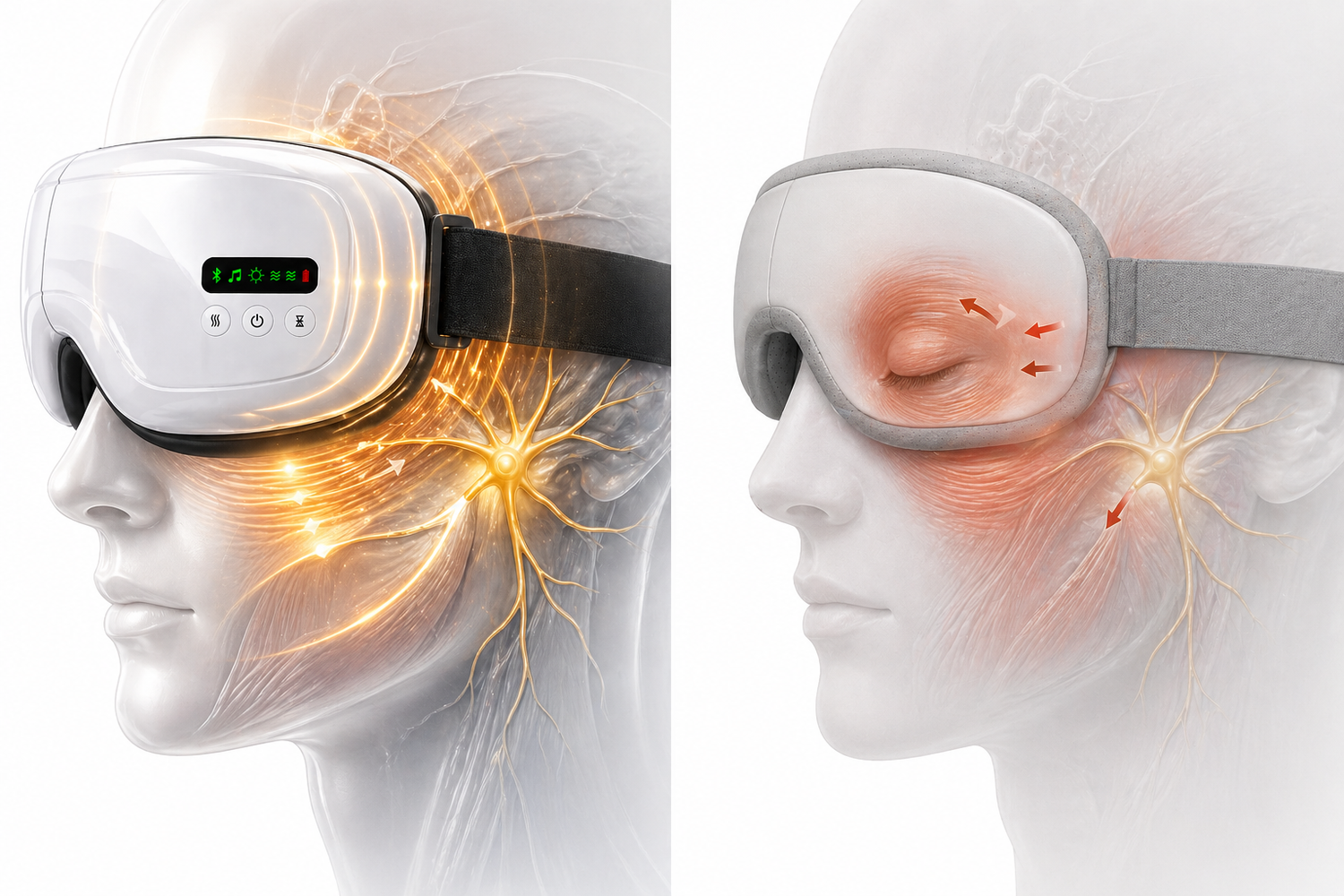 But standard eye massagers only do one phase — they vibrate, or they warm slightly, or they compress weakly. The heat doesn't reach the muscle layer. The vibration can't release a locked muscle. There's no cooling phase to seal the release.